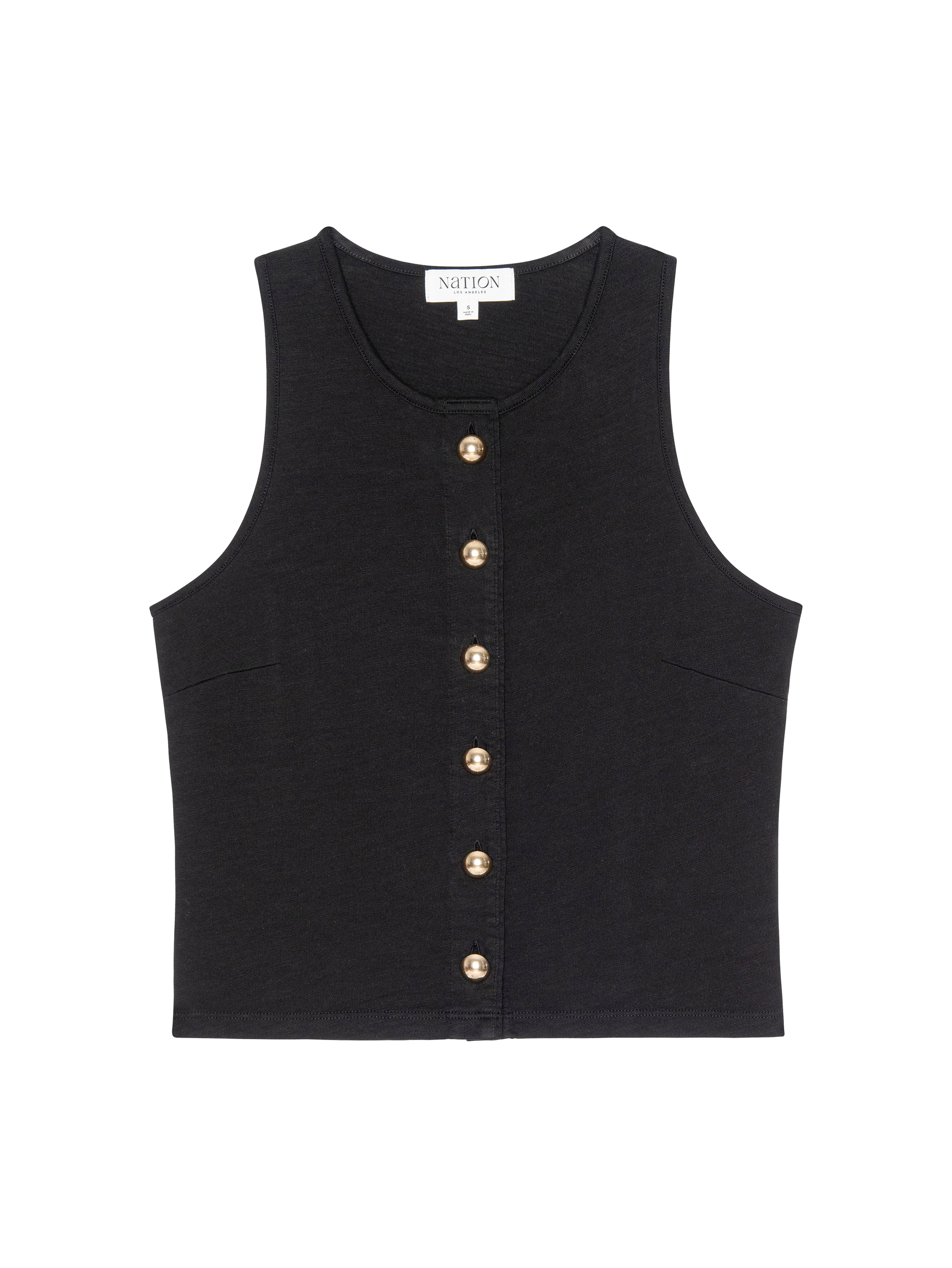 This versatile tank features a crew neckline and functional placket with our signature gold buttons imported from Italy. Do it all the way up for a polished look, or leave it partially open for a perfectly undone vibe. This one comes in Jet Black.