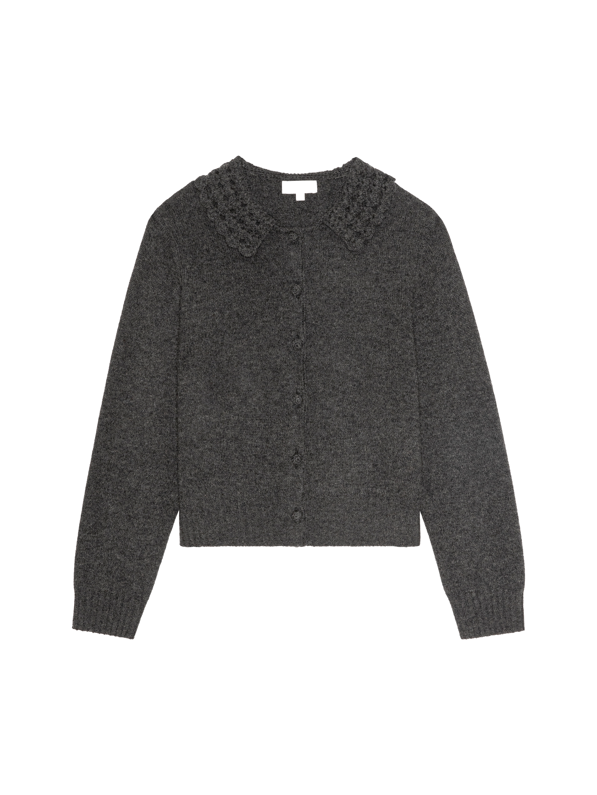 The Addie Cardigan wraps soft texture in effortless style—knit in 100% merino wool with a relaxed fit. A hand-crocheted Peter Pan collar and bishop sleeves bring subtle volume and refinement to a piece you can wear anywhere.