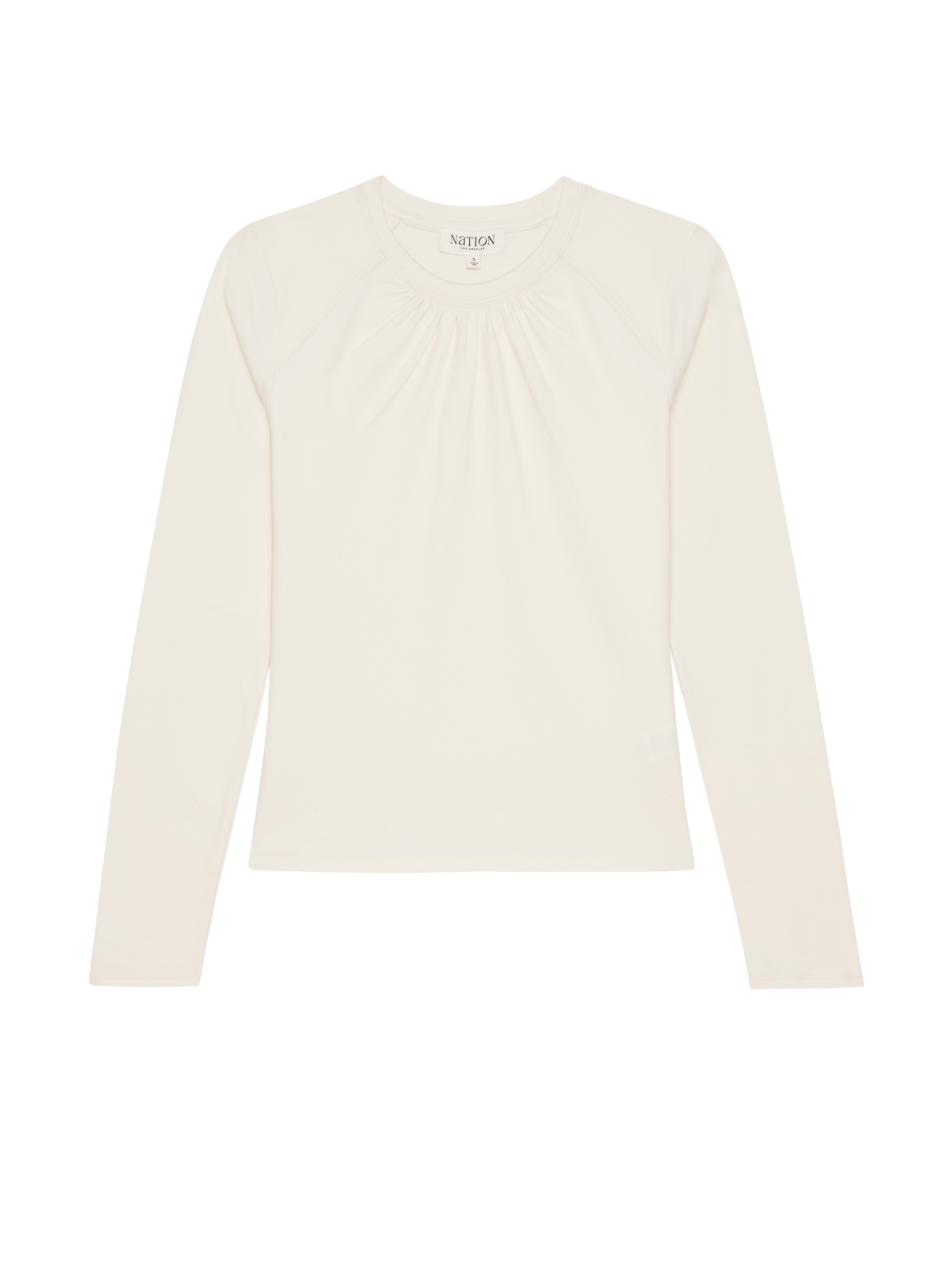 A simple raglan long sleeve meets subtly chic details with shirring at the crew neckline and a front yoke. We call it casual sophistication. (This one comes in Porcelain.)