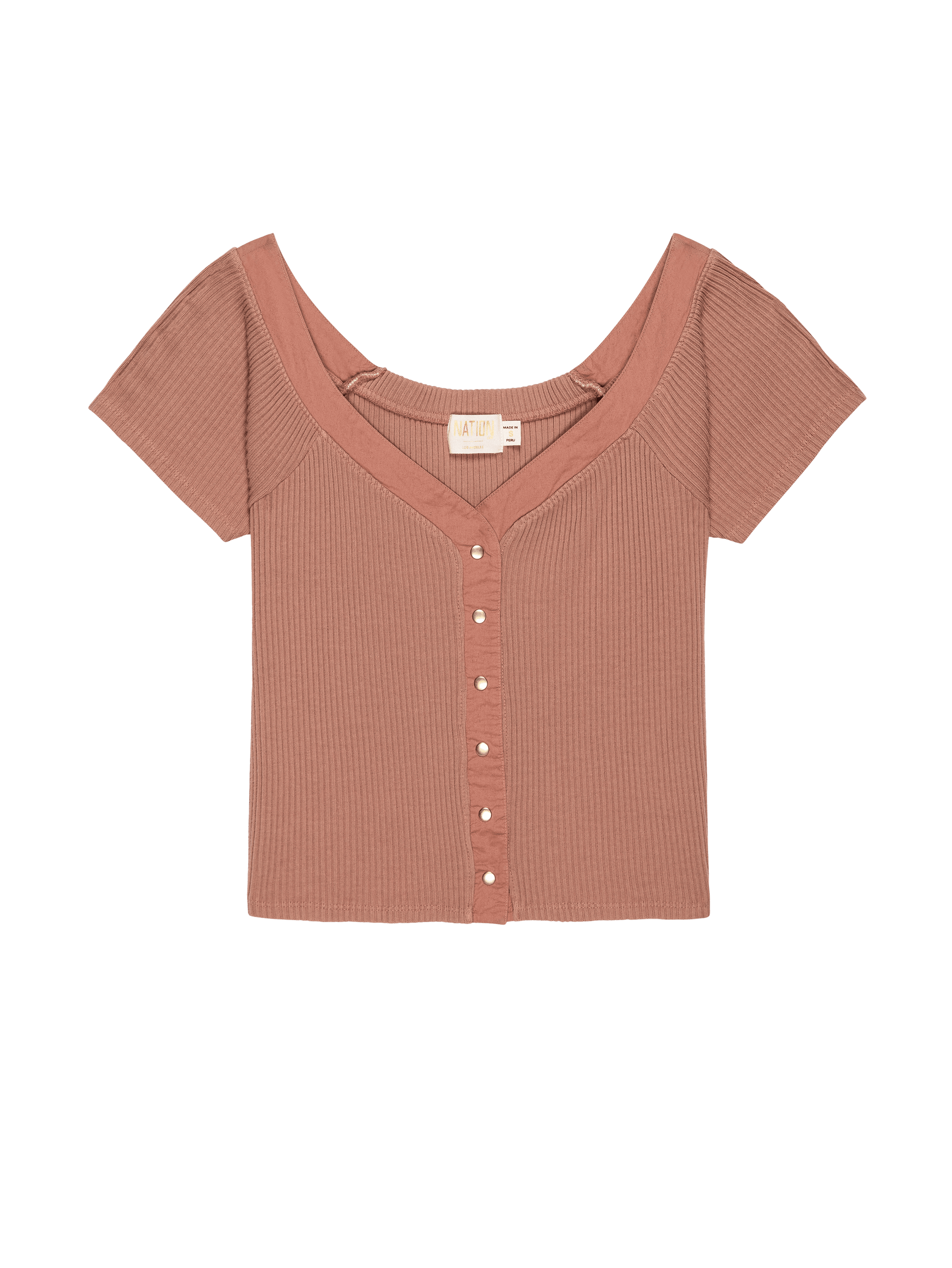 It's an elevated ribbed tee with a contrast Pima Cotton Poplin placket and chic gold snaps, perfectly off the shoulder without slipping off your shoulders. You're welcome. (This one comes in Mocha Mousse.)