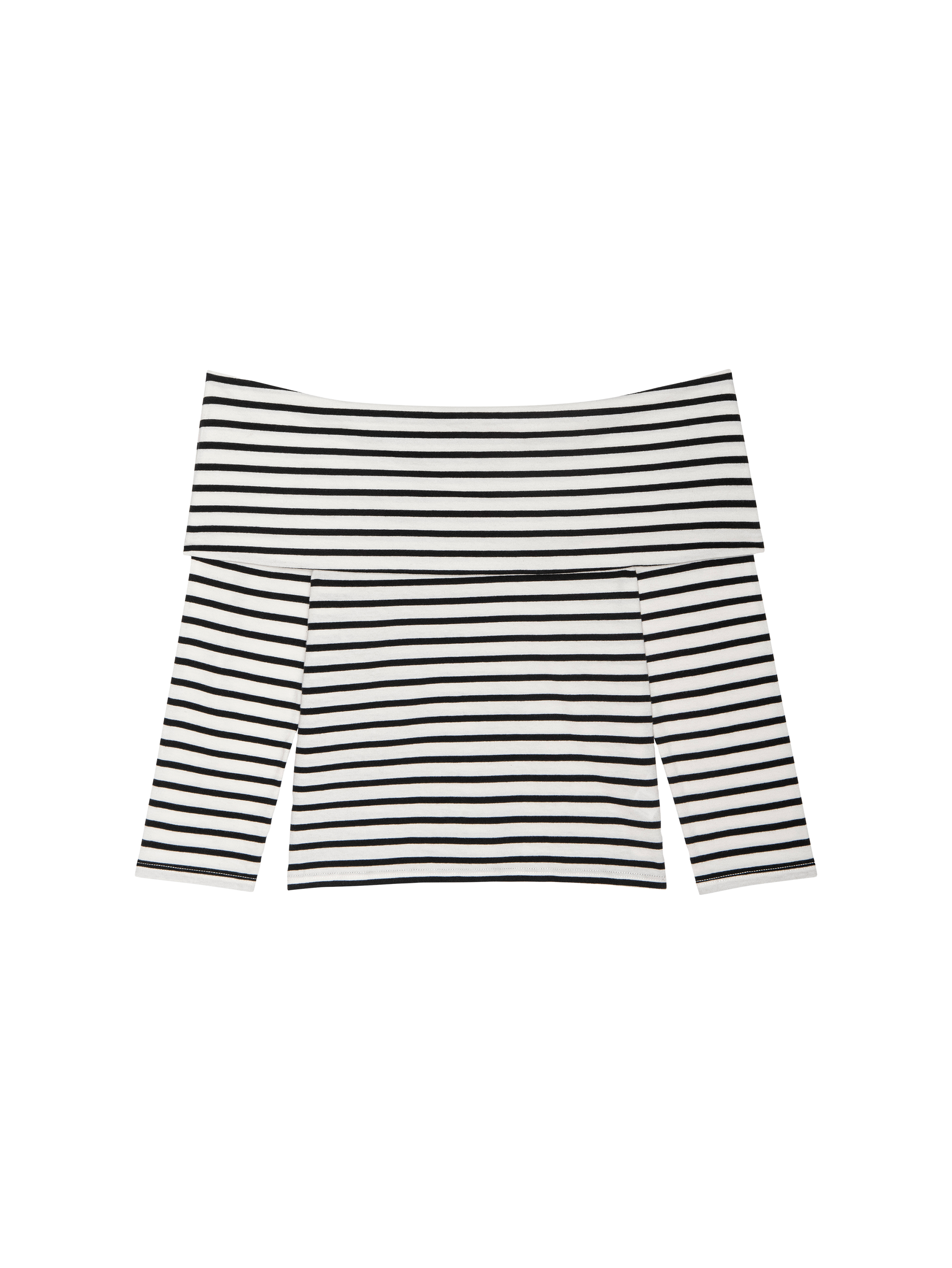 A feminine classic, this organic cotton off-shoulder knit top features a subtle folded neckline, three-quarter sleeve, and fitted bodice for a beautifully chic, yet effortless, fit. This one comes in Cross Walk Stripe.